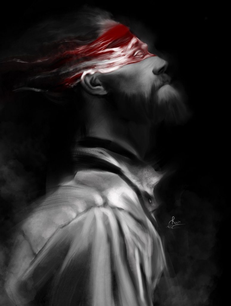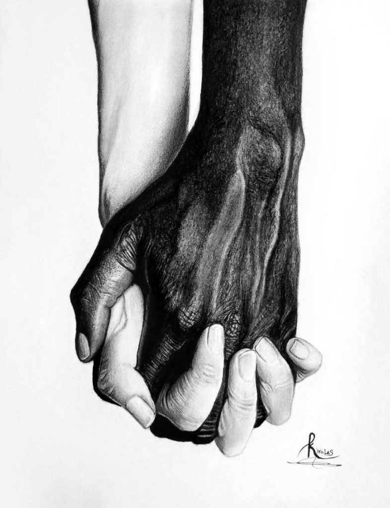 In un altro, due mani – una chiara, una scura – si intrecciano con forza, raccontando senza bisogno di parole la fratellanza, l’uguaglianza, l’amore. E ancora: corpi maschili che si frantumano in aria, guerrieri con ali e tamburi, uomini bendati che sfidano l’oscurità. Ogni disegno è un colpo al petto.
