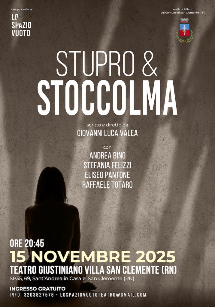 Sabato 15 novembre, ore 20.45, al Teatro Giustiniano Villa di San Clemente (Sant’Andrea in Casale), va in scena la nuova produzione de Lo Spazio Vuoto dal titolo “Stupro & Stoccolma”
